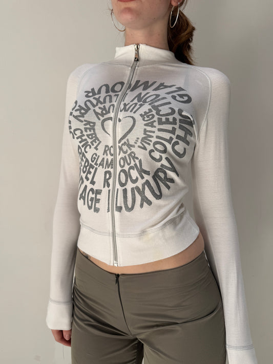White Silver Zip Up Graphic Thin Jumper - Size Small