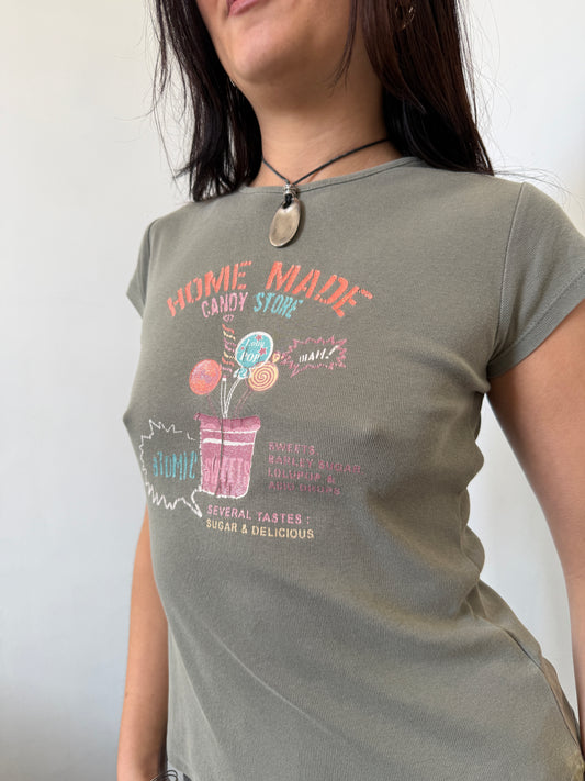 Khaki Green Graphic Baby Tee - Size Extra Small