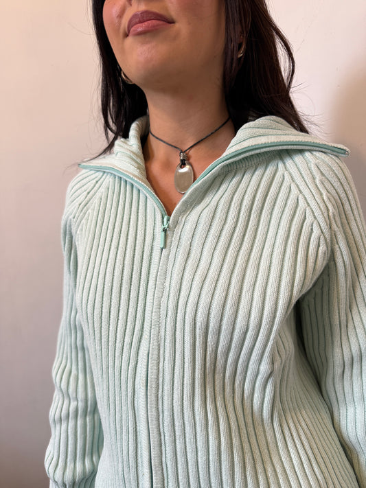 Teal Aquamarine Ribbed Knitted Zip Up Jumper - Size Extra-Large