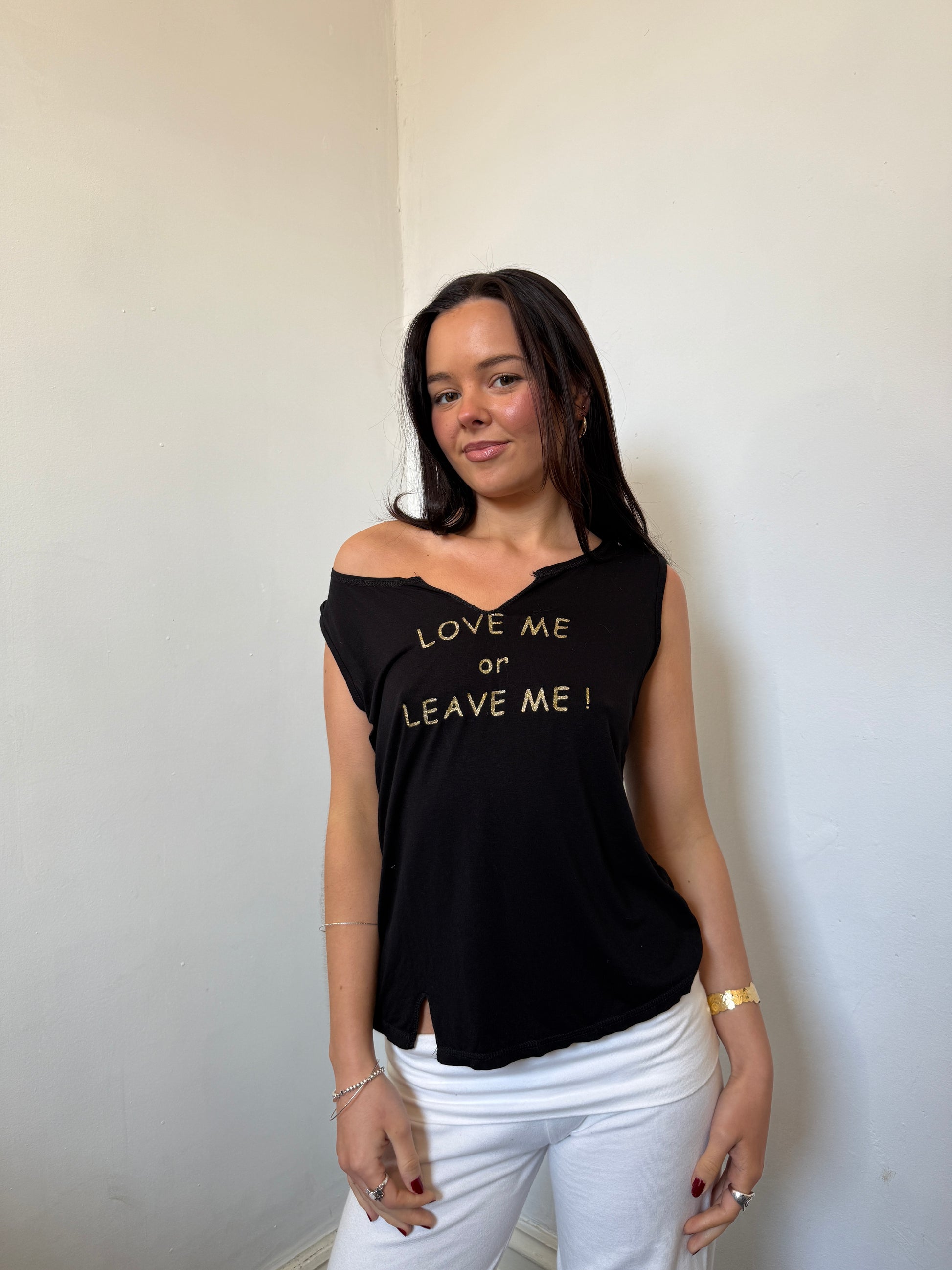 Black with gold writing that says Love Me or Leave Me tank top. Small slit in the bottom.