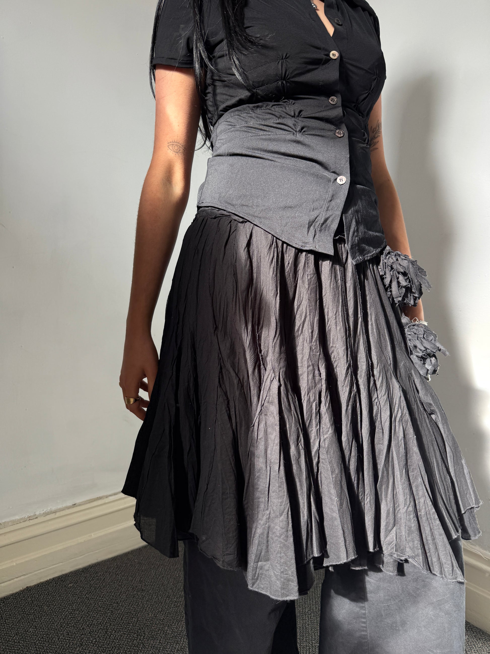 Black long layered skirt with flower tie to waist. Looks good on its own or over pants.
