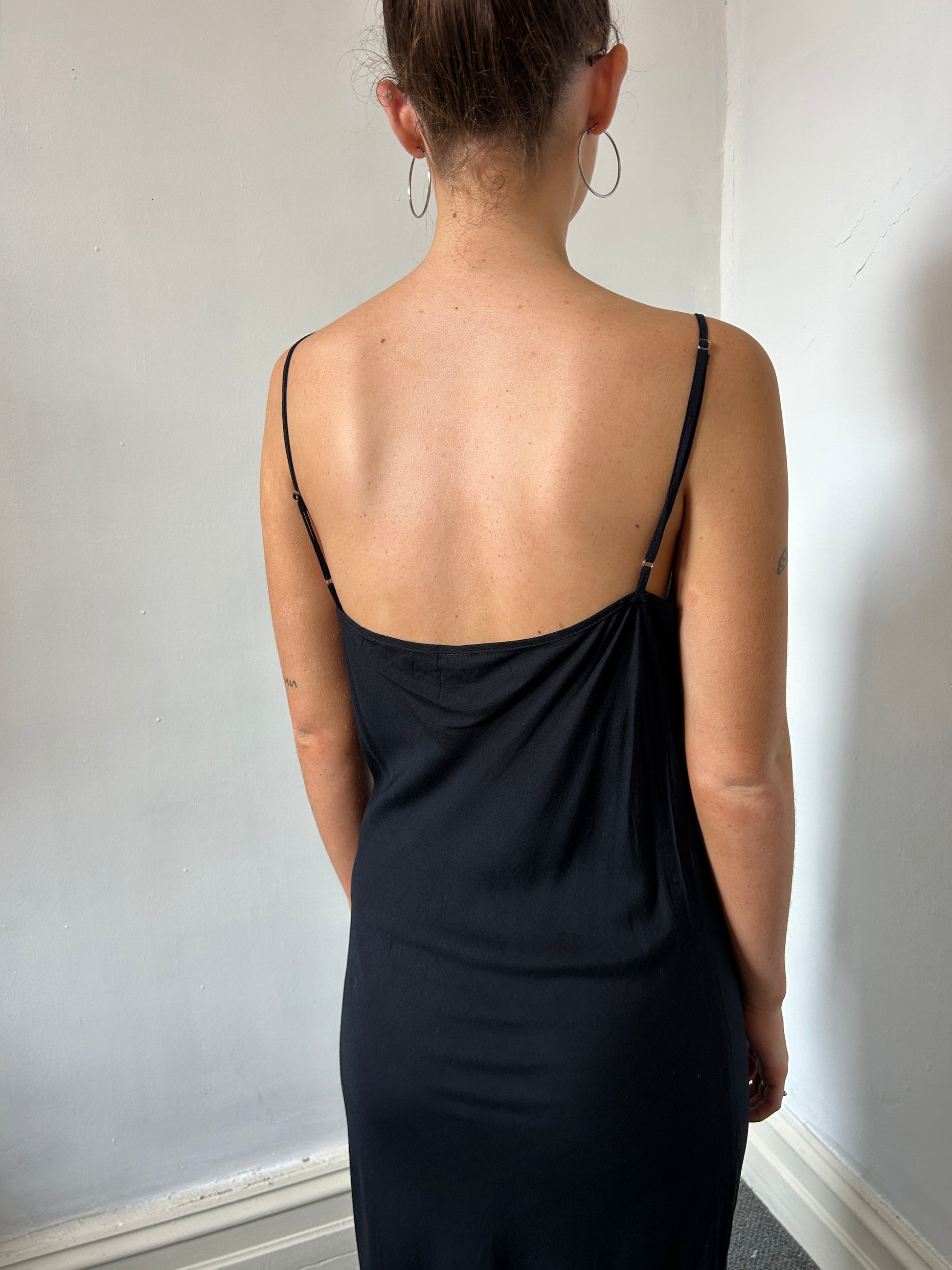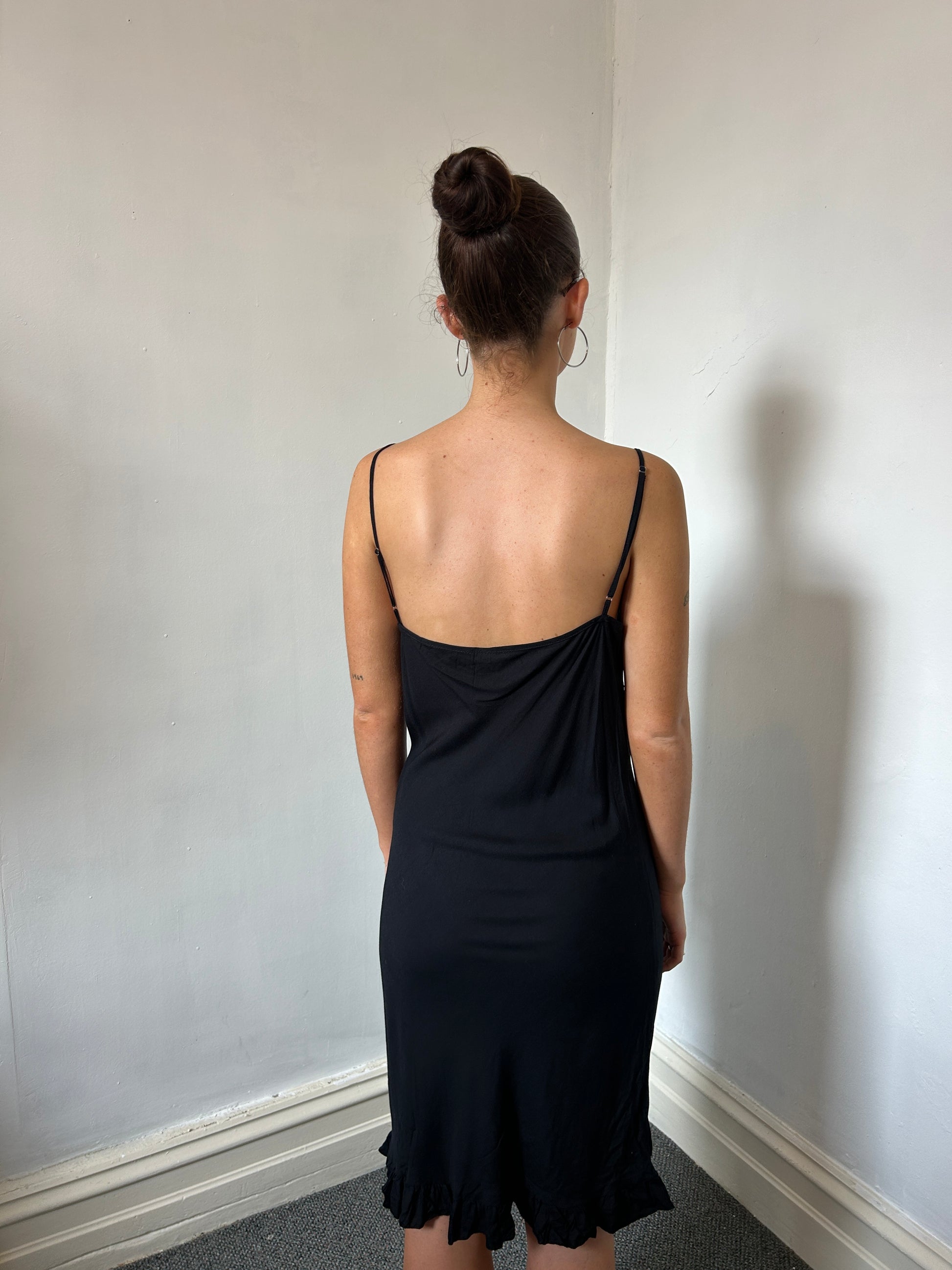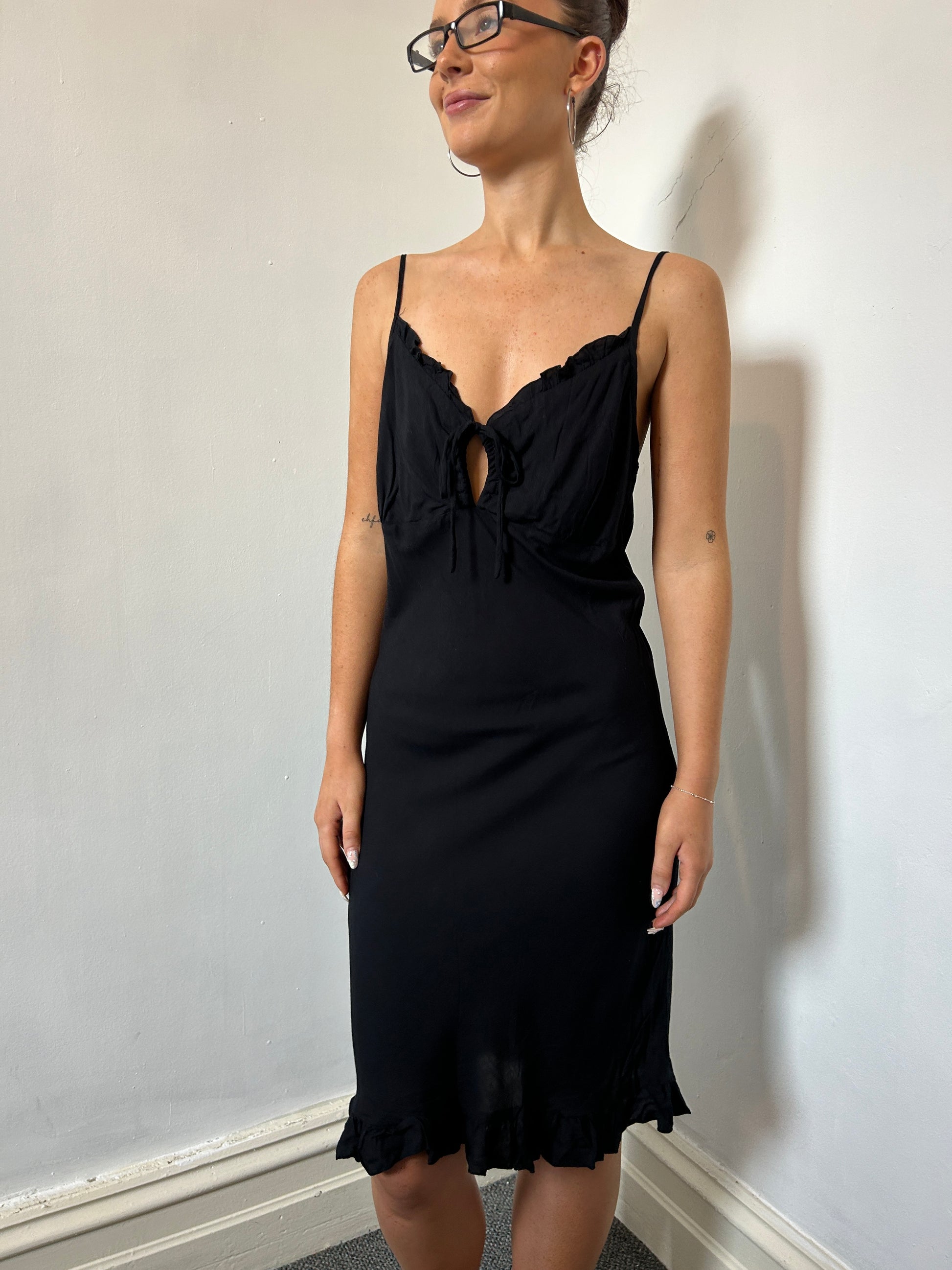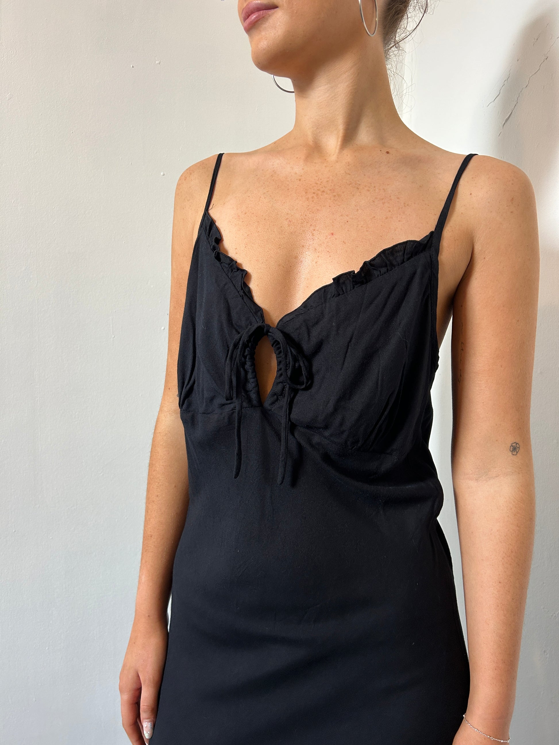 Black long dress with ruffle detail and tie on the chest. Perfect for formal evenings or after the beach.