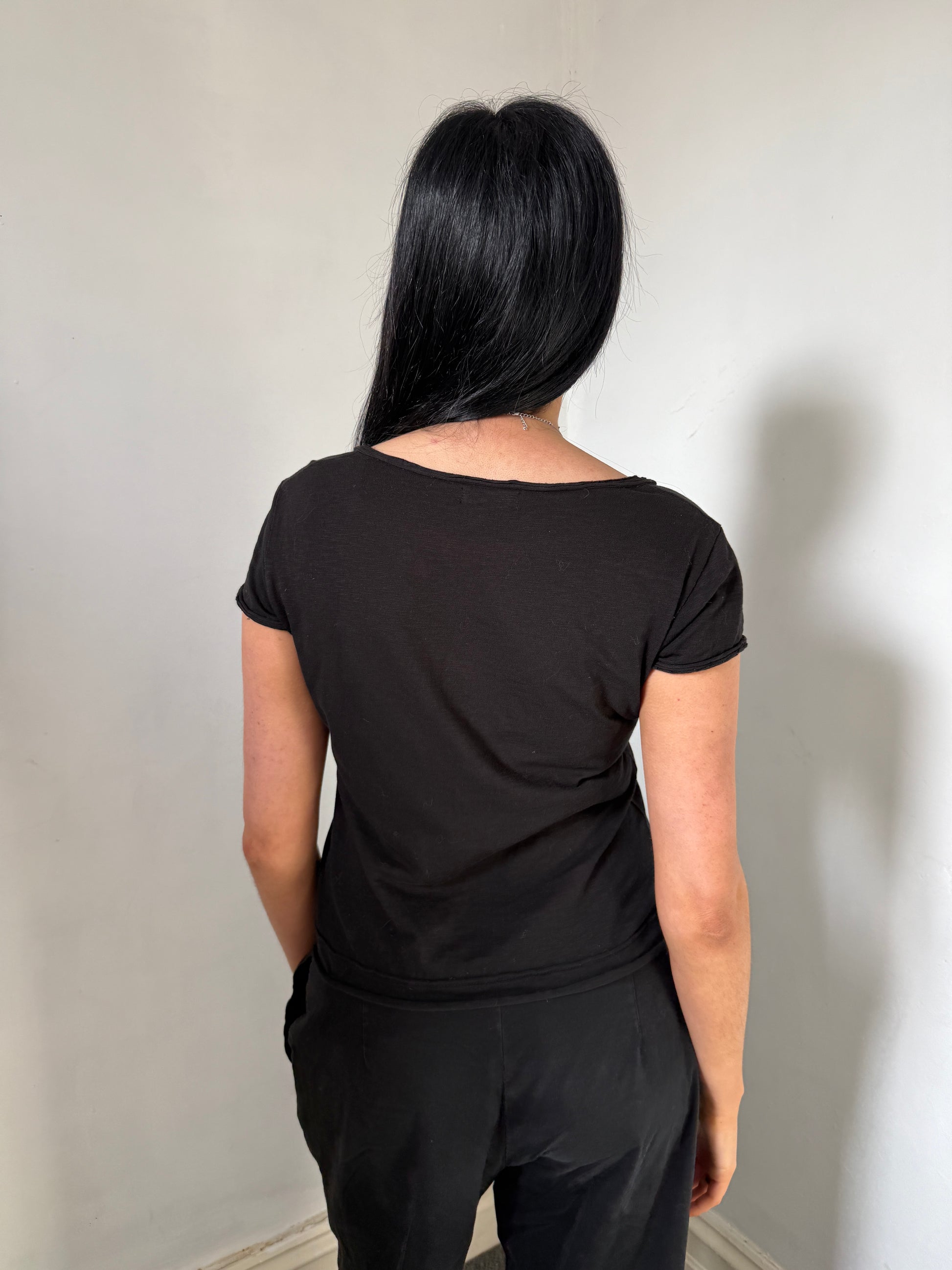 Black graphic Made In The USA baby tee. Scoop neck with buttons. Faded look to writing.