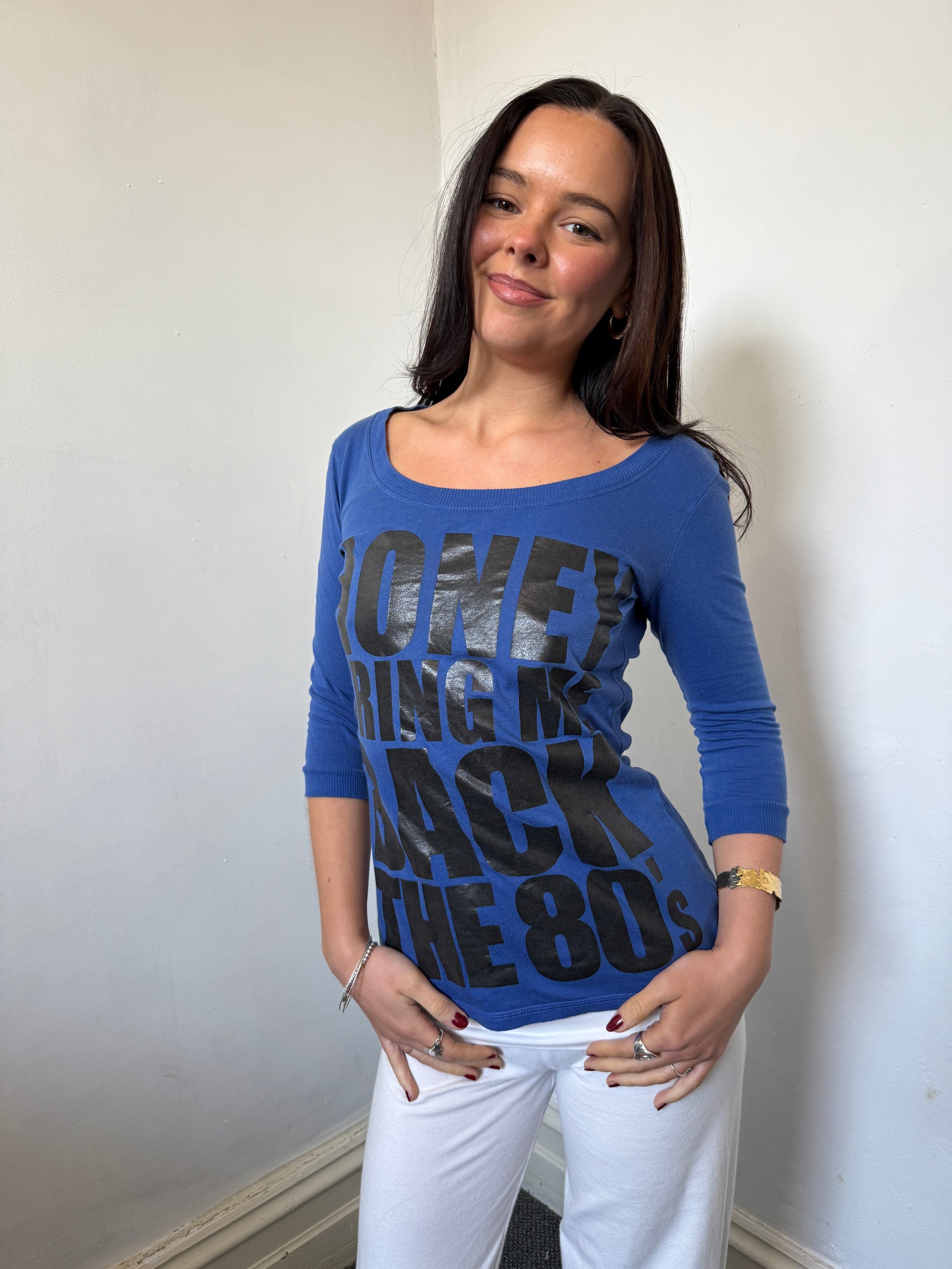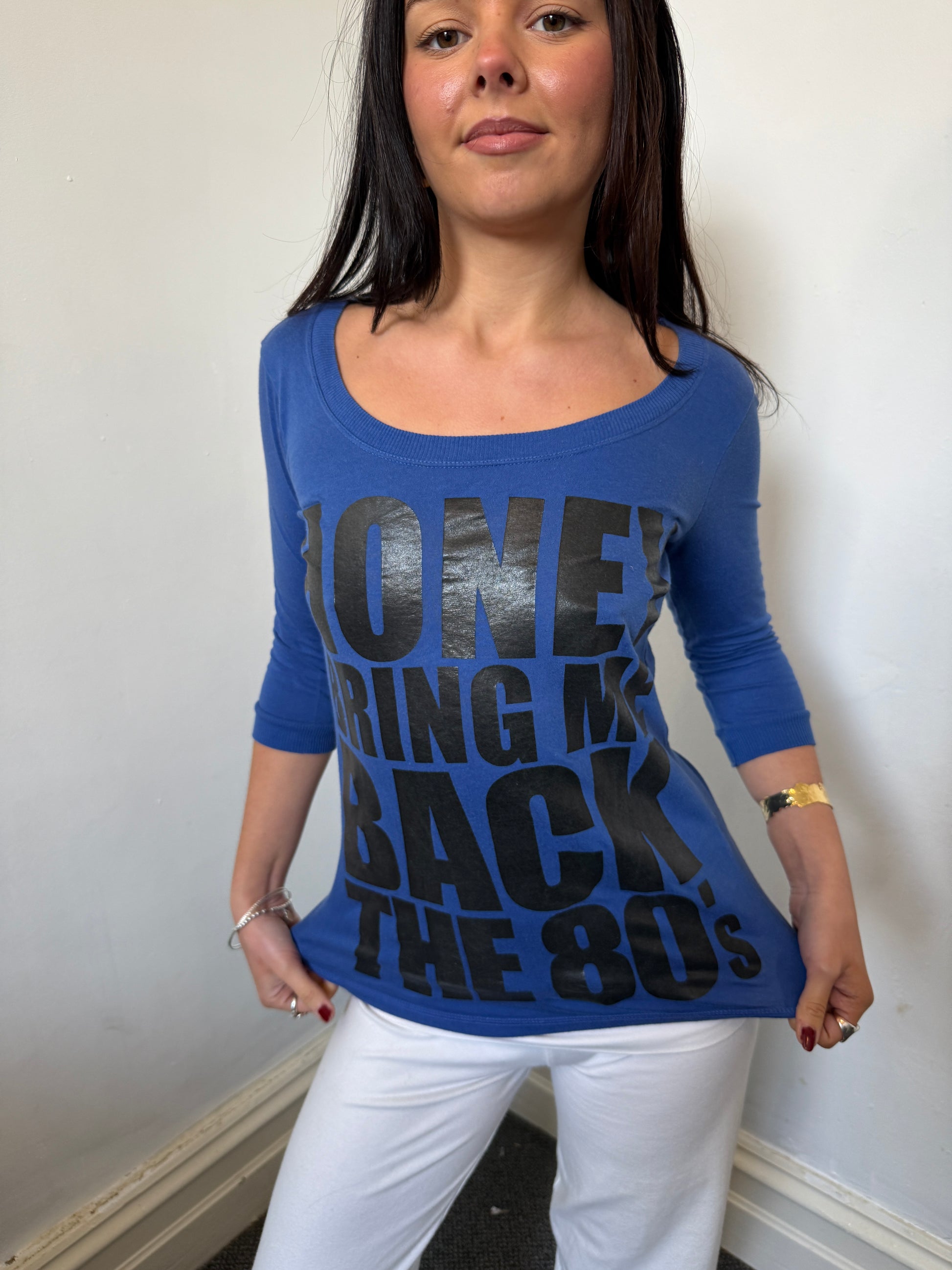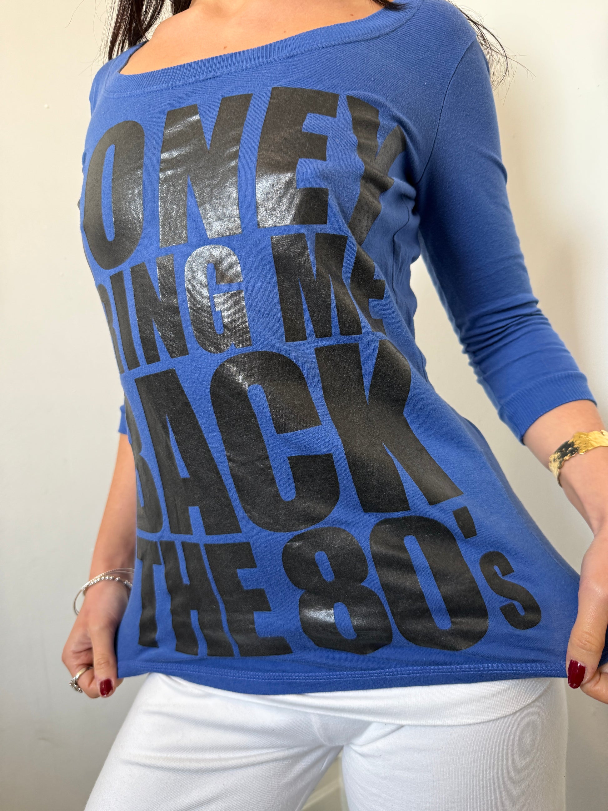 Blue and black graphic ‘Honey Bring Back The 80s’ top.