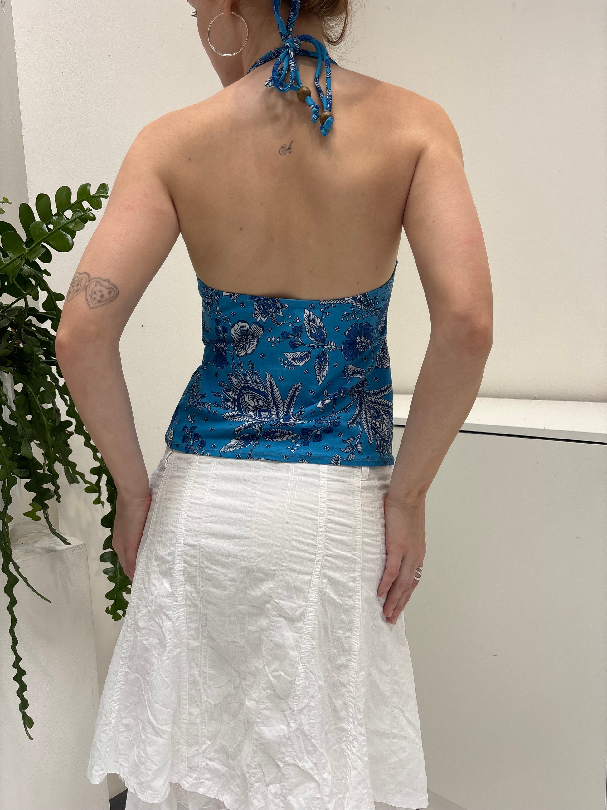 Blue paisley patterned halter neck top with.