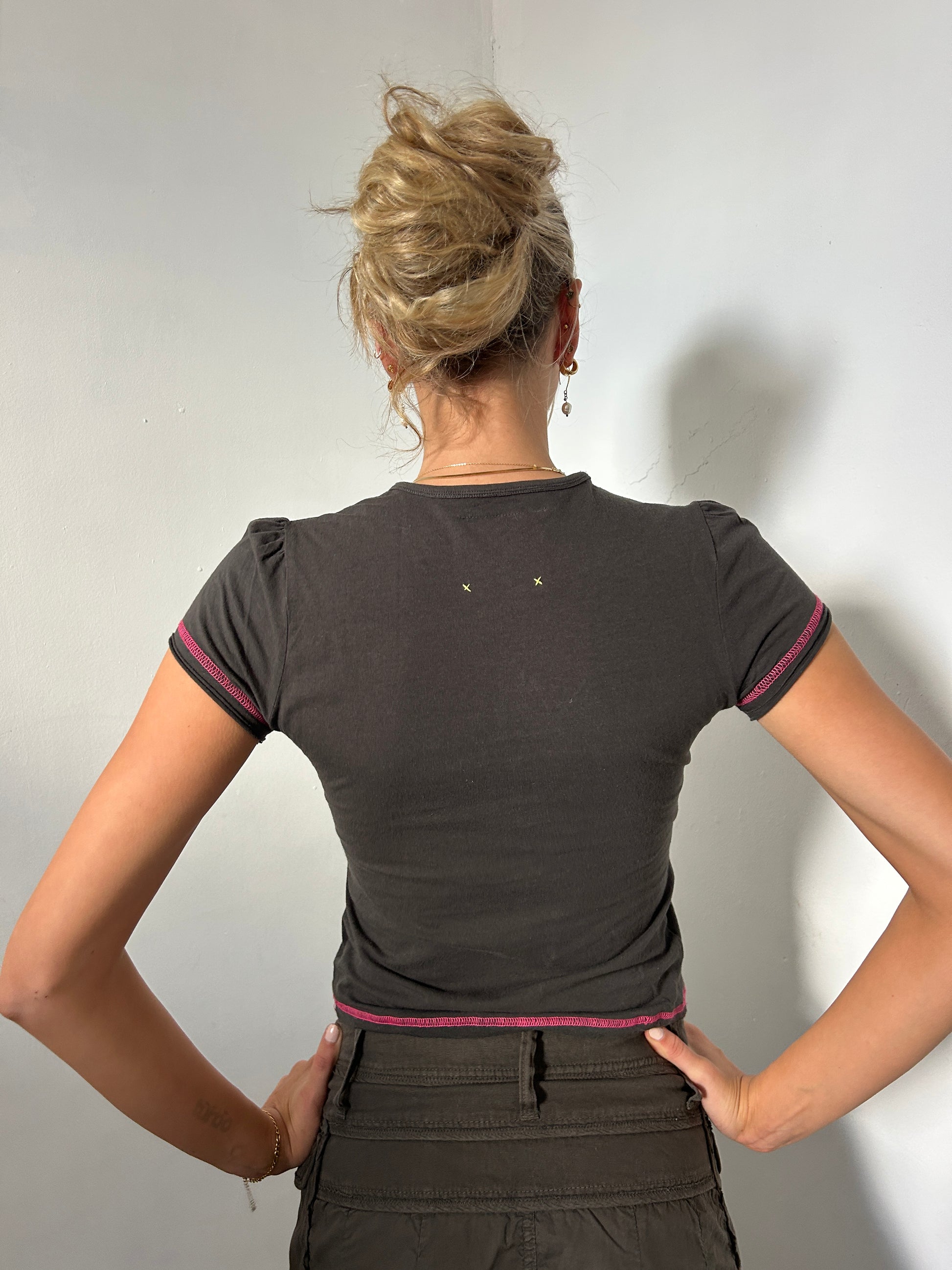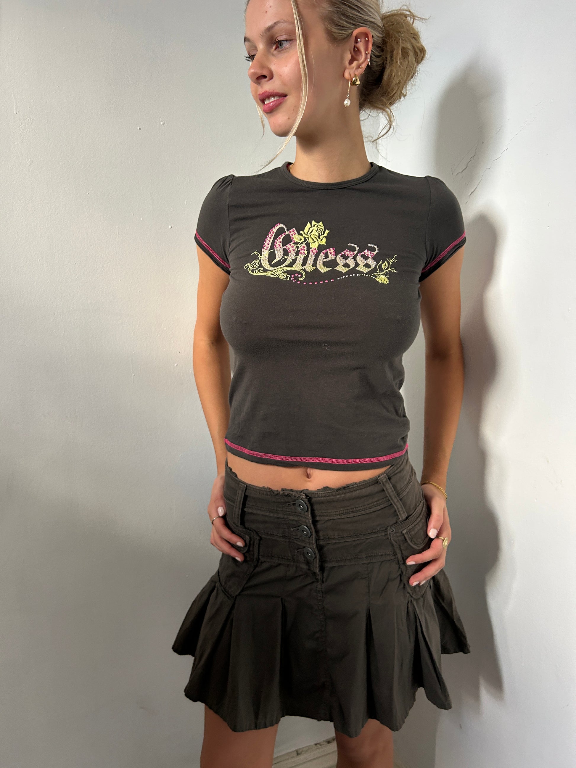 Guess Jeans baby tee with pink and yellow/green rhinestones. Pink stitching on arm and bottom.