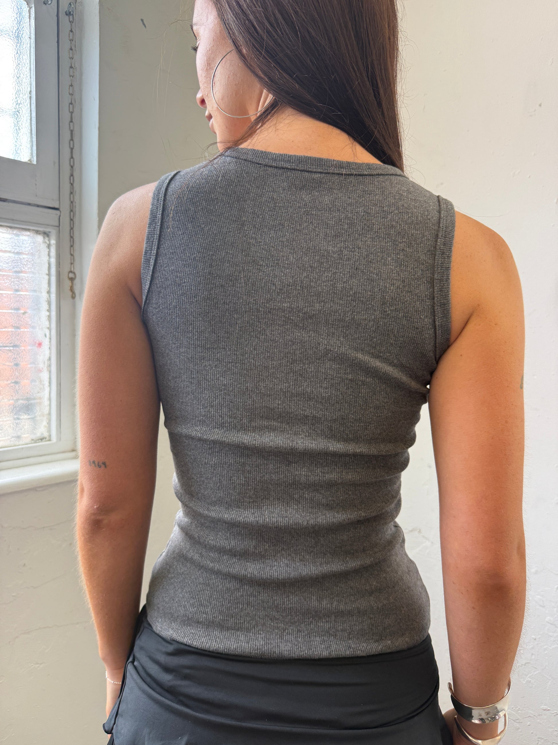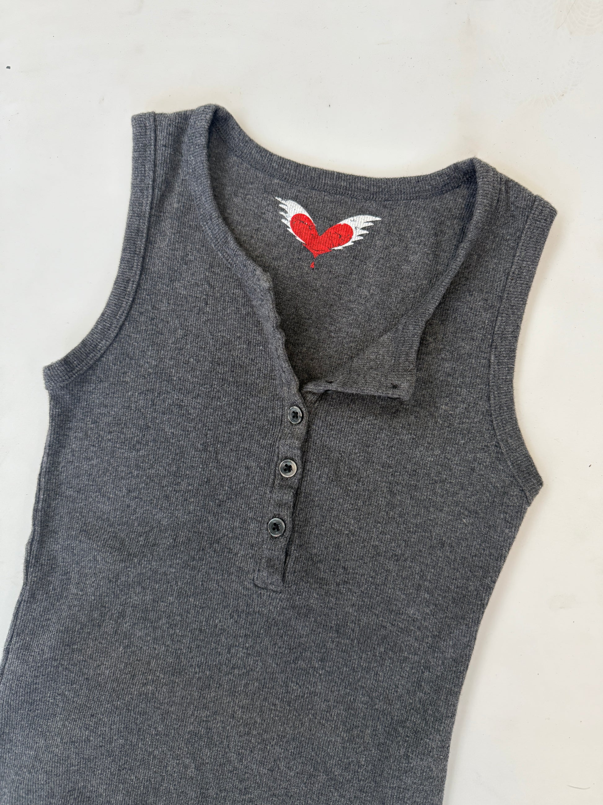 Grey ribbed tank top with 5 buttons and grommets along bottom. Buttons can be undone (see last two pics).