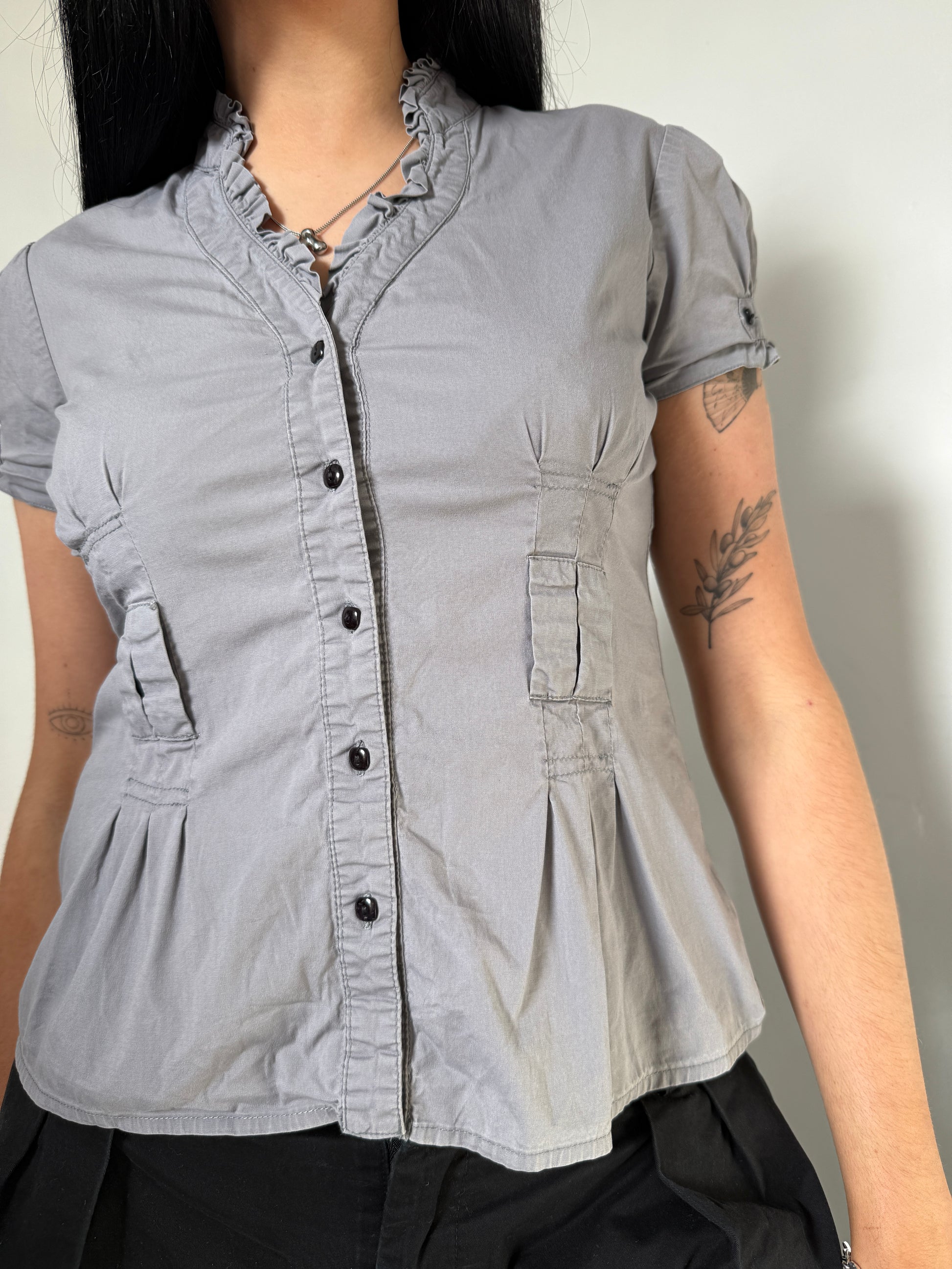 Grey button up shirt with puff sleeves and cinched detail to back.