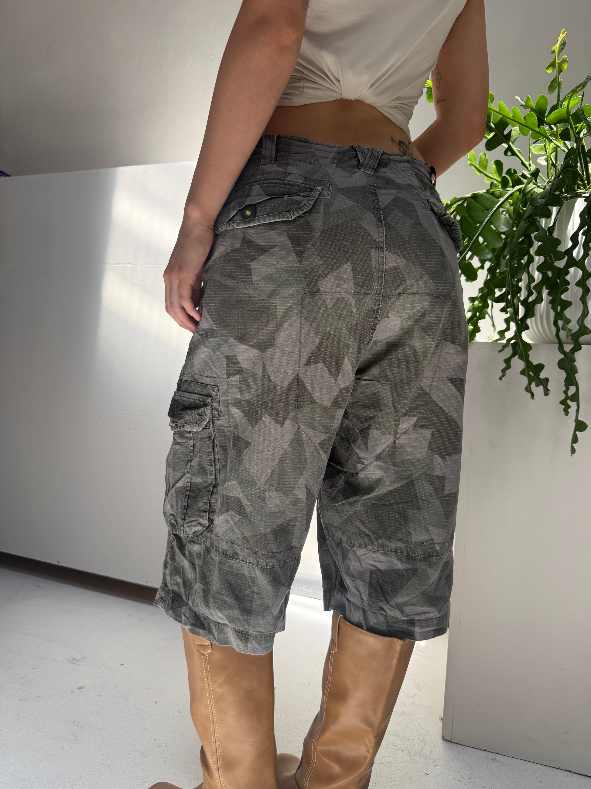 Khaki patterned with yellow logo capris.
