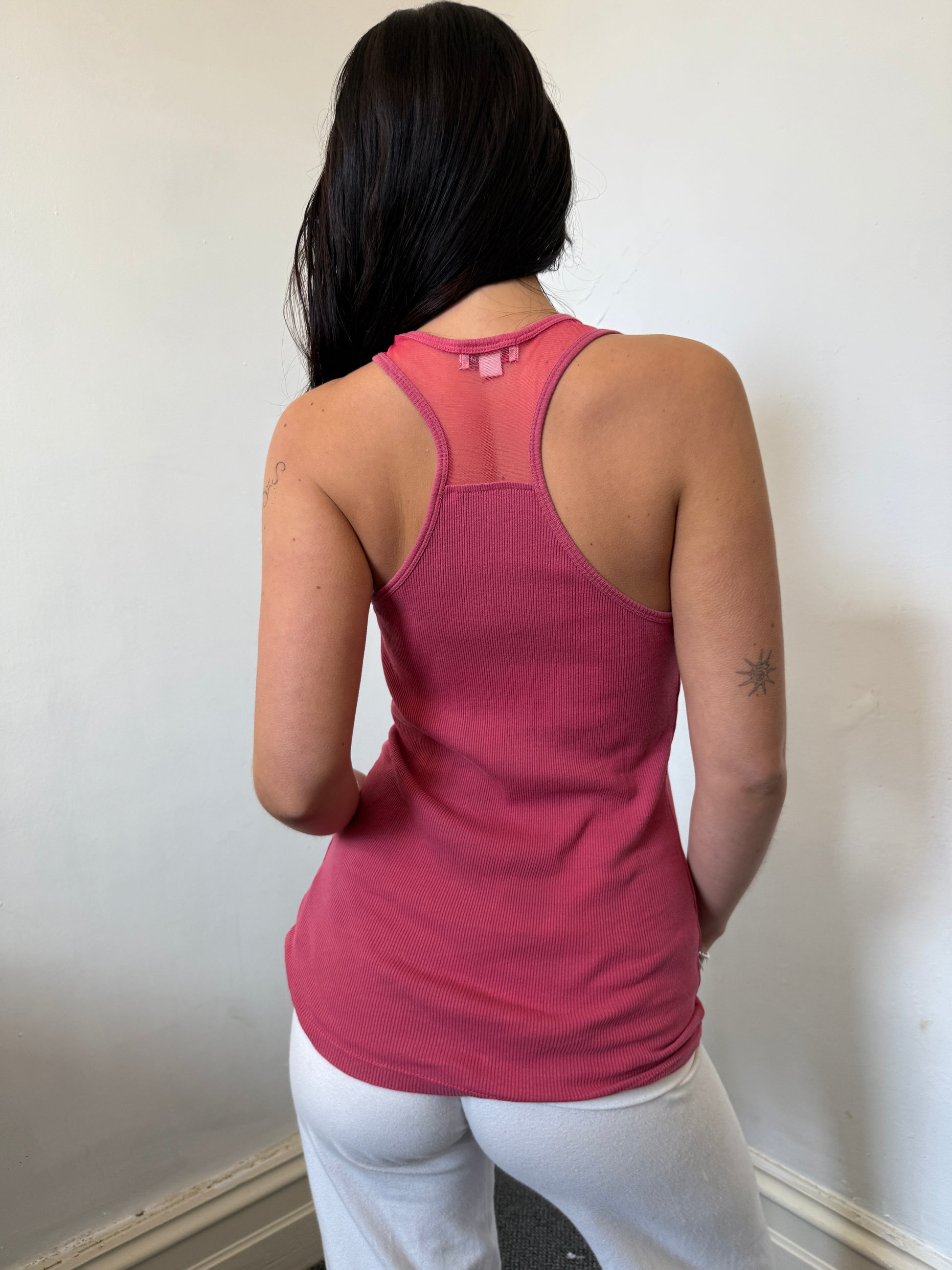 Pink ribbed Guess tank top with mesh racer back. Sequin detail all over.