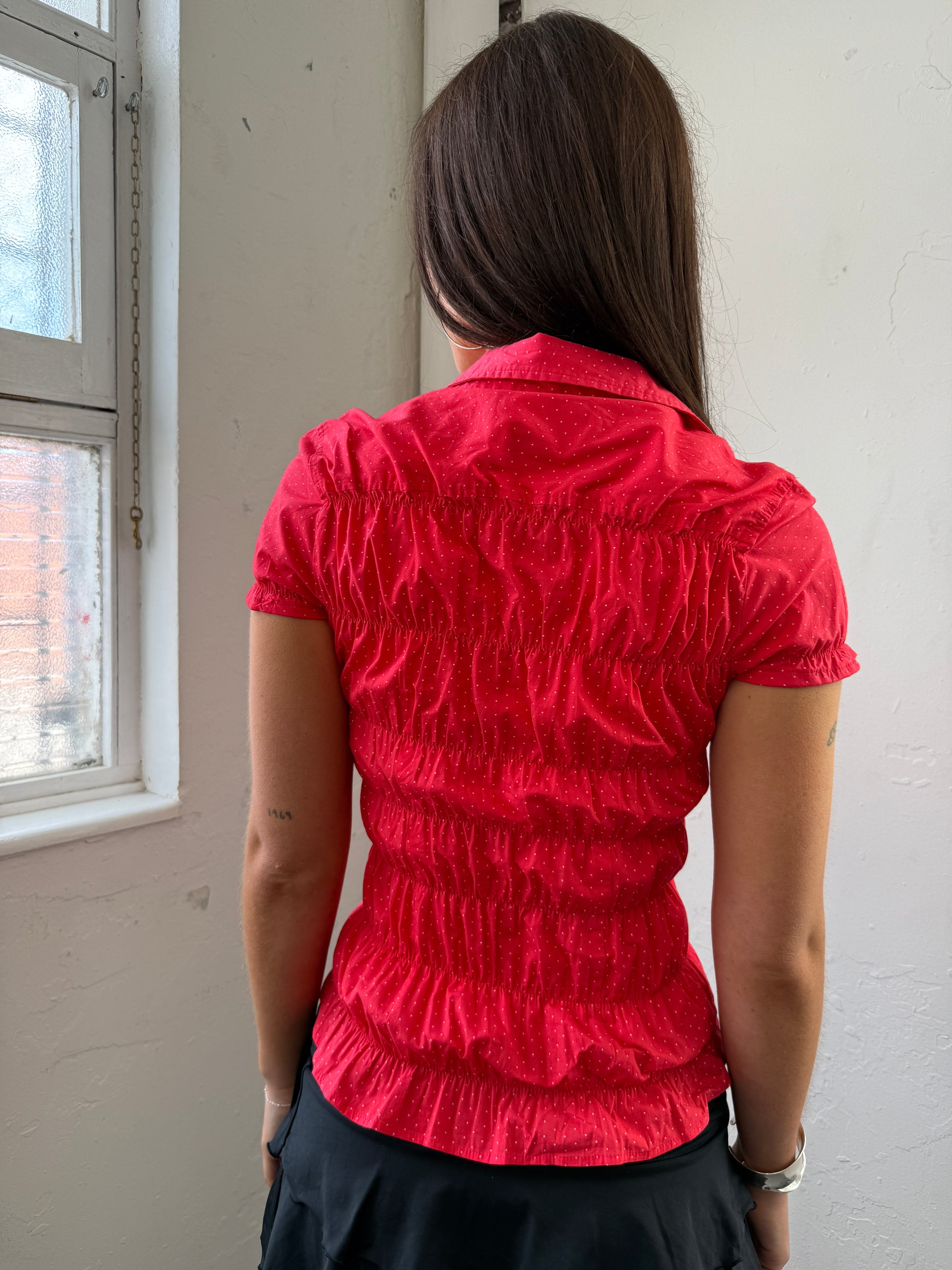 Raspberry and White Reworked Polka Dot Smock Shirt - Size Small