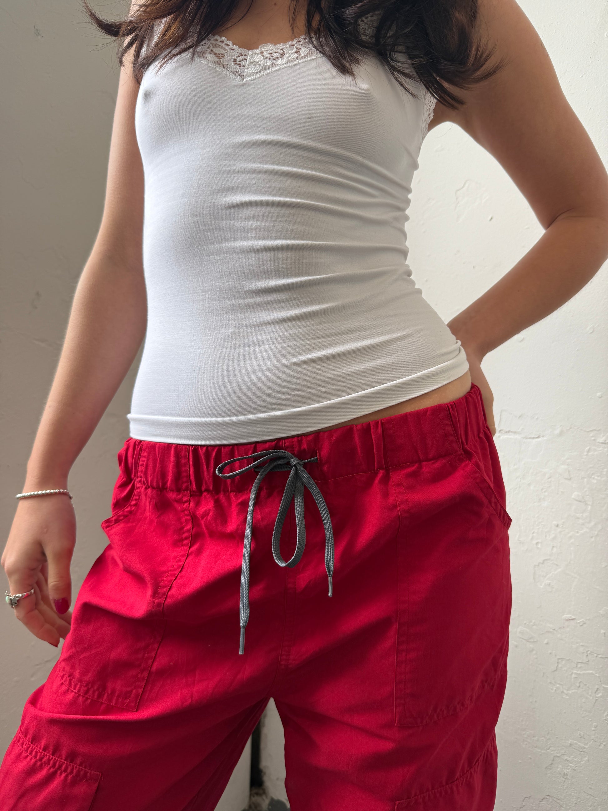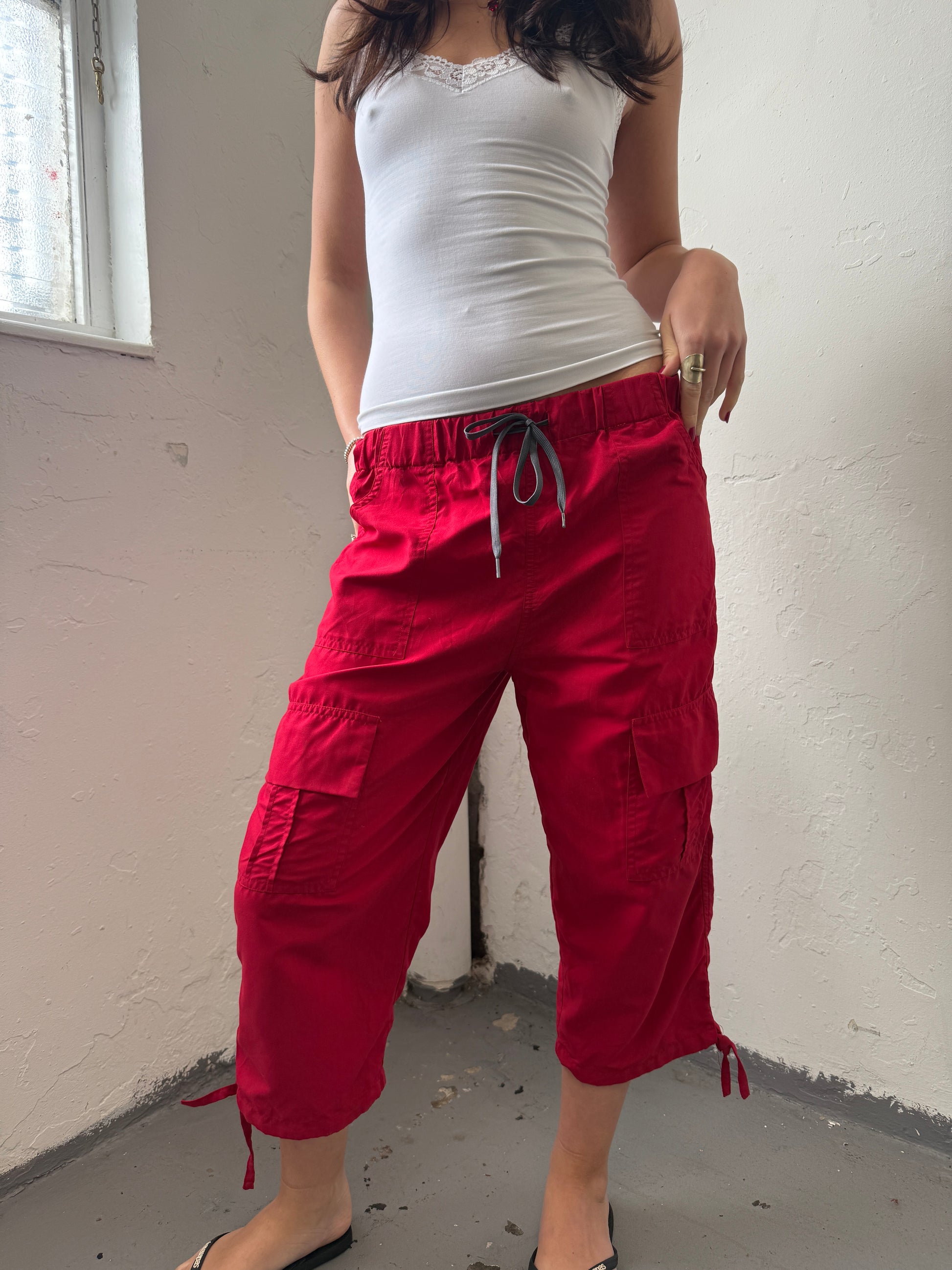 Red capris with grey drawstrings. Perfect for spring/summer. Ties to bottom of legs to create more of a cinched look.