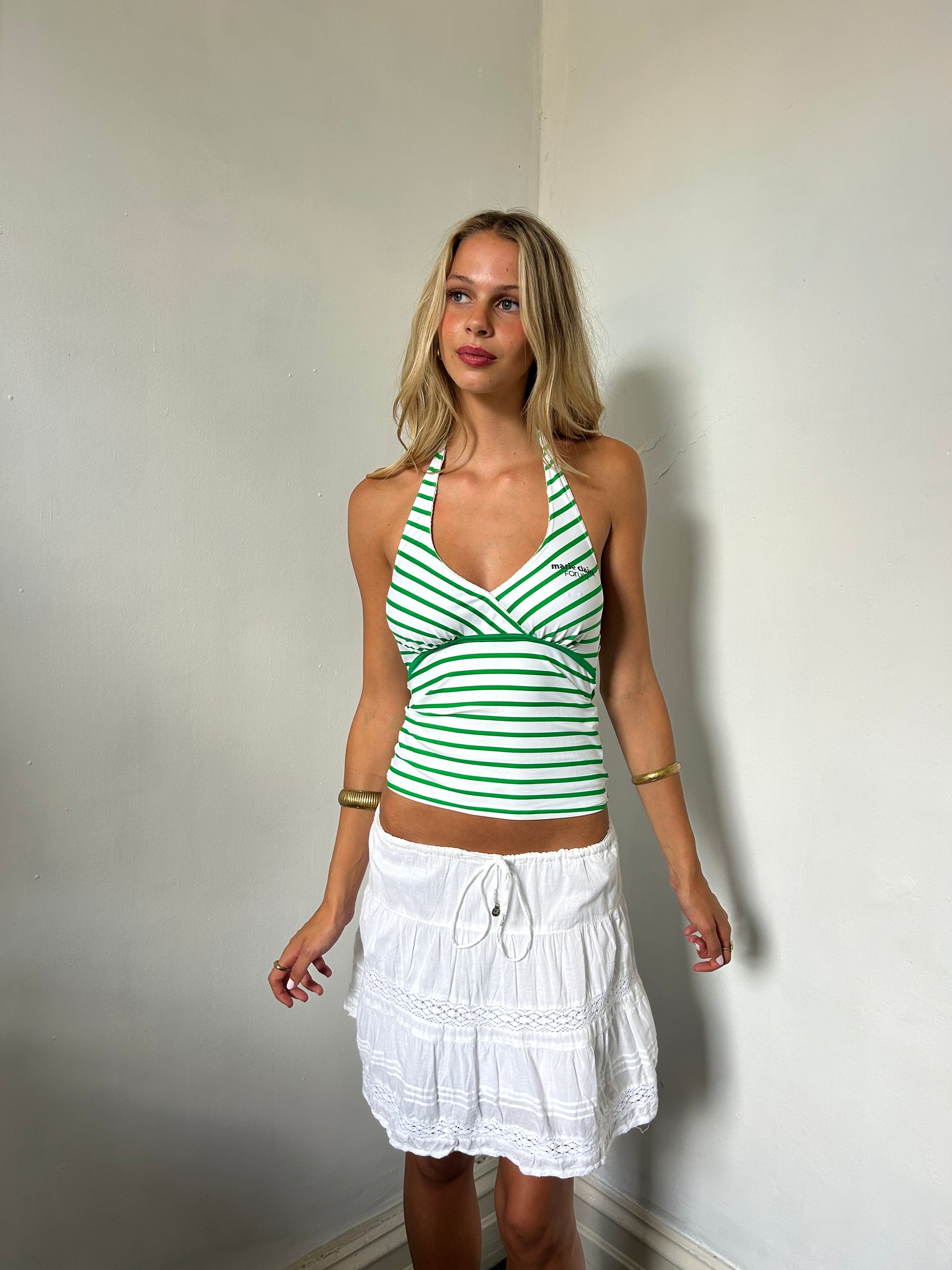 The most perfect white midi skirt. Broderie anglaise detail and tie waist. Vintage Hollister and has the cutest logo on the waist tie.